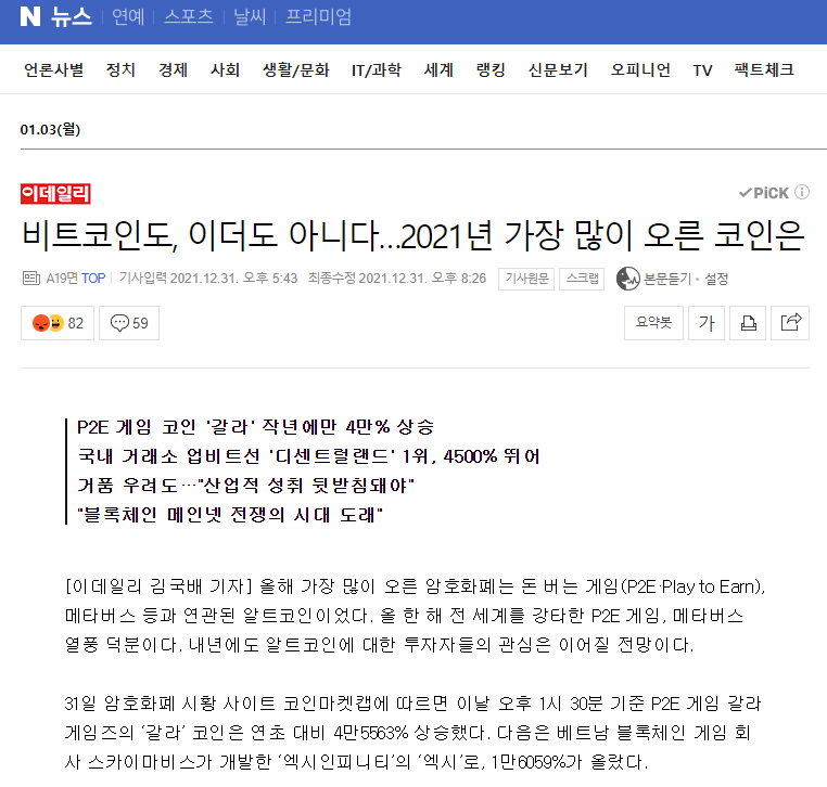 2021년 가장 많이 오른 코인은 어떤 코인이신지 아시나요? 많은 분들이 엑시인피니티, 샌드박스, 디센트럴랜드를 생각하시겠지만 가장 많이 오른 코인은 요즈음 핫한 P2E 게임사인 갈라게임즈의 '갈라' 코인입니다. 이 갈라 코인은 연초 대비 4만 5563%나 상승을 했는데요, 정말 엄청난 상승을 보여주었지요?