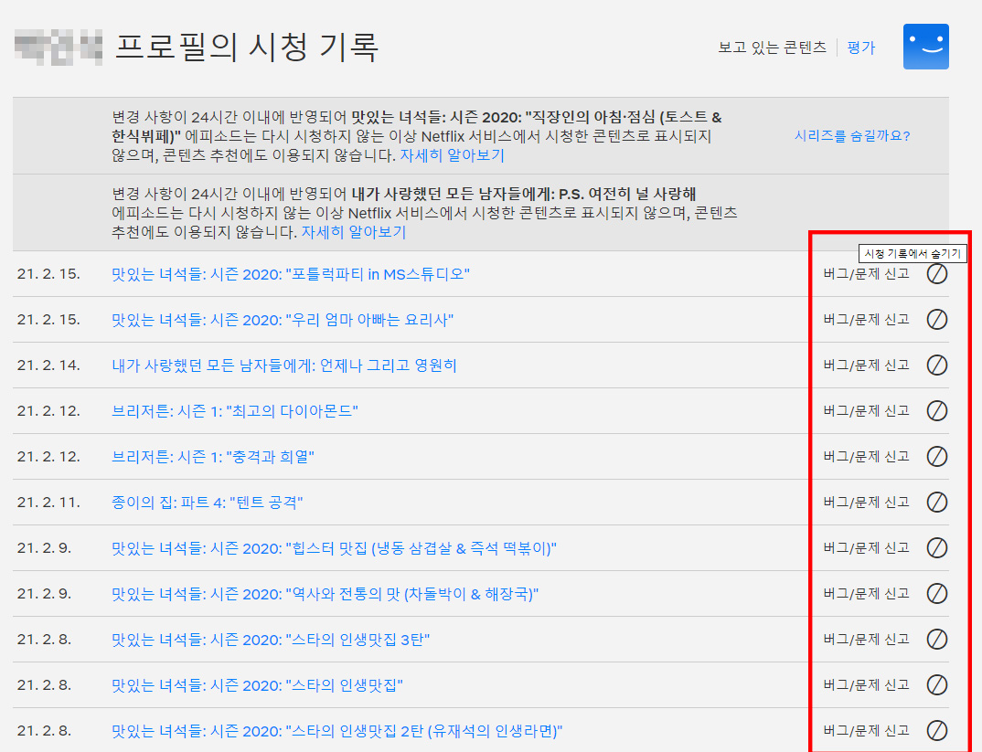그렇게 되면 내가 보았던 프로필의 시청 기록이 나오게 되는데요, 여기서 자기가 지우고 싶은 드라마나 영화만 골라서 기록을 지우고 싶다면 옆에 버그/문제 신고 옆의 마크를 클릭해주시면 그것만 시청기록에서 숨길 수 있습니다.