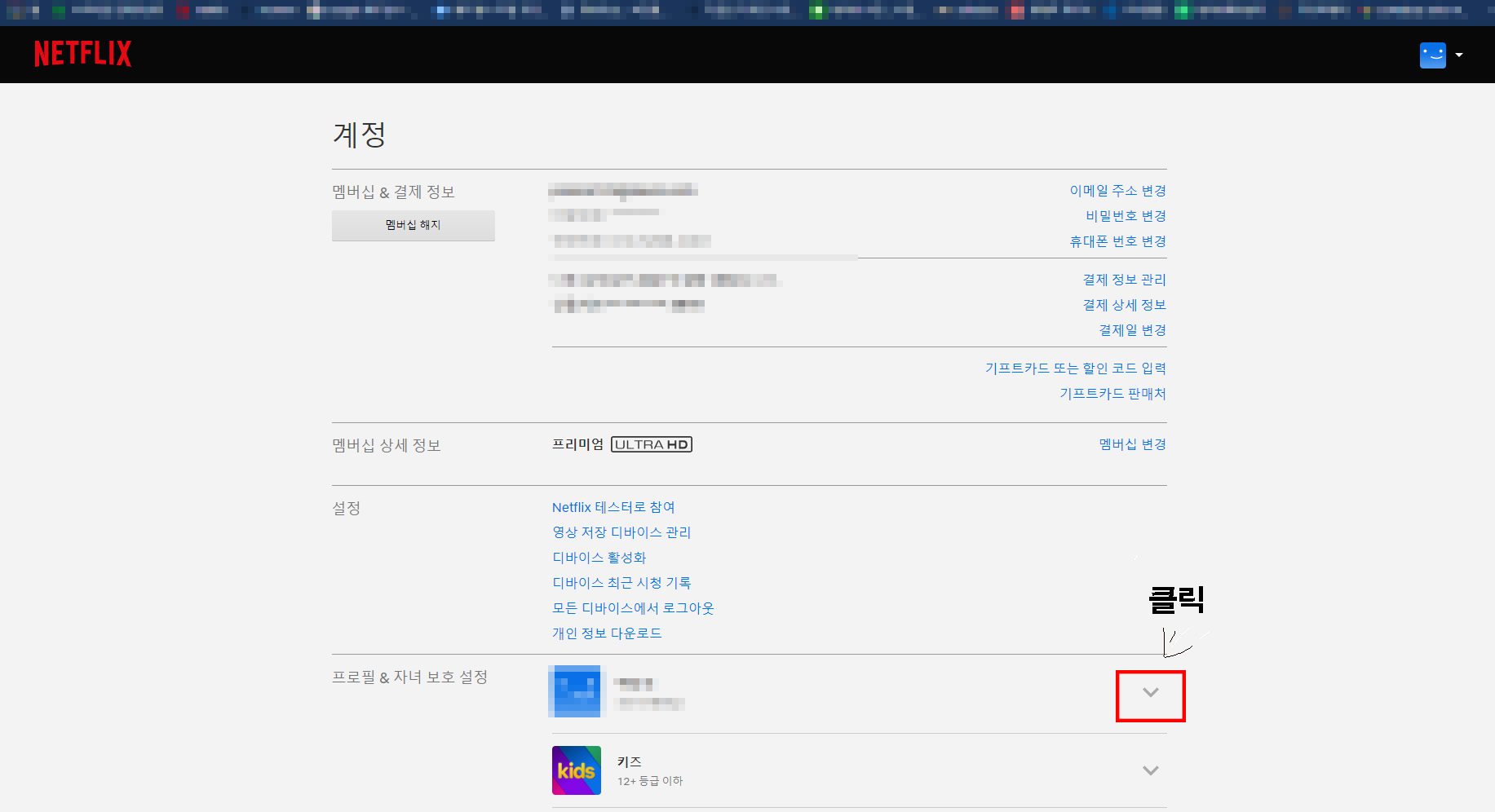 그렇게 누르면 멤버십 상세 정보와 정보를 변경할 수 있는 메뉴 그리고 각종 계정에 대한 설정을 할 수 있는 이런 창이 뜨게 되는데요, 그중에서 프로필 & 자녀 보호 설정에 있는 자신이 시청기록을 지우고 싶은 프로필의 오른쪽의 아래 표시를 누르면 됩니다.