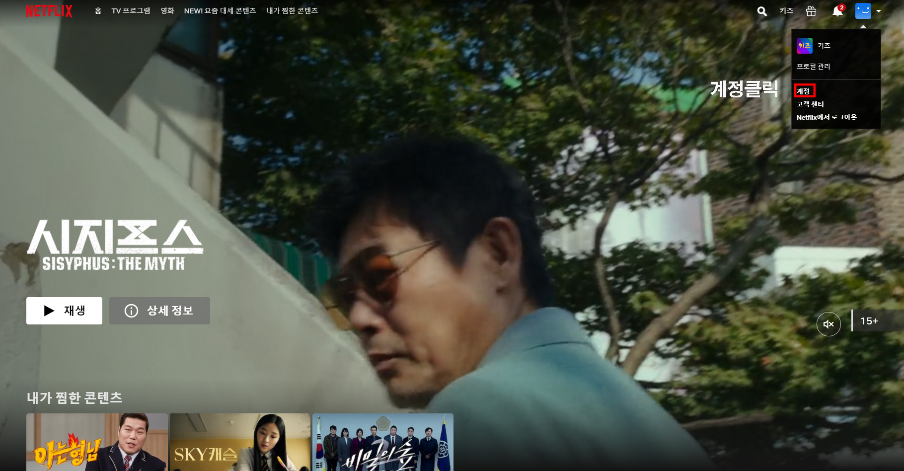 먼저 P넷플릭스 시청기록 지우는 방법인데요, 넷플릭스에 로그인을 한 후에 메인 화면이 나오면 오른쪽 맨 구석에 있는 프로필 위에 마우스를 나누게 되면 저렇게프로필 관리, 계정, 고객 센터, NETFLIX에서 로그아웃이 나오게 됩니다.
