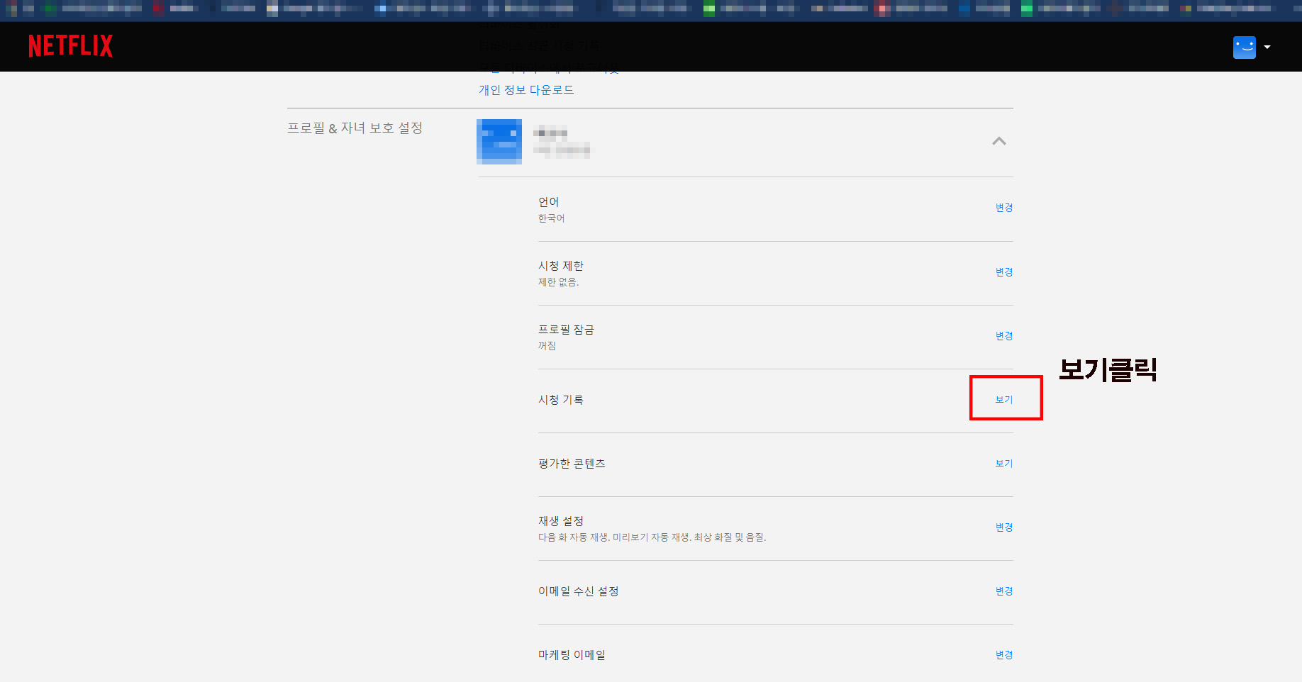그럼 이렇게 언어, 시청 제한, 프로필 잠금, 시청 기록, 평가한 콘텐츠, 재생 설정, 이메일 수신 설정, 마케팅 이메일 등을 변경 혹은 볼 수 있는 화면이 나오게 되는데요 여기서 우리는 넷플릭스 시청기록을 지워야 하기 때문에 시청 기록 옆에 보기를 클릭해주면 됩니다.