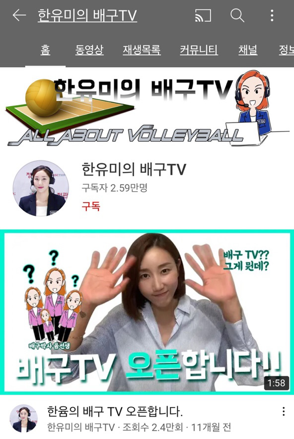 한유미 전 배구 선수는 현재 한유미의 배구 TV라는 유튜브 채널도 운영을 하고 있는데요, 2020년 2월 28일에 활동을 시작하였고 스포츠에 관련된 내용 외에도 브이로그를 올리고 현역 여자 선수들을 게스트로 부르는 실시간 스트리밍을 하고 있어서 배구 팬들에게 많은 인기를 받고 있습니다.