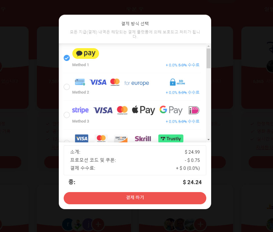 닫기를 누르시고 결제하기를 누르시면 이렇게 원하시는 결제 수단으로 결제를 하실 수 있습니다. 저 같은 경우에는 편리하게 카카오 페이를 통해서 결제를 하고 있어요.