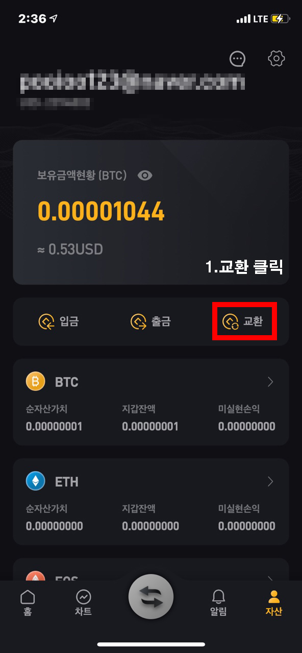 그렇다면 코인 교환은 어떻게 할까요!? 바이비트 모바일 어플에서 자산을 눌러줍니다. 그리고 교환을 눌러주시면