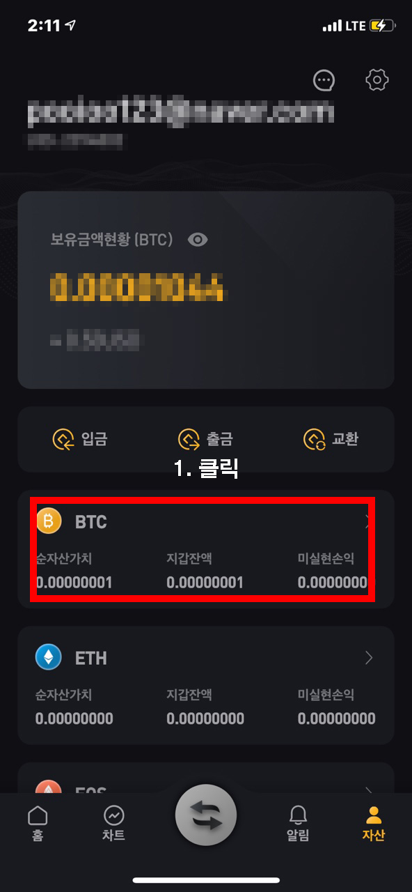 누르면 이제 자신이 보유하고 있는 코인들이 나오는데요 우리는 비트코인을 송금하기로 했으니 BTC를 클릭해주시면 됩니다.꼭 입금할 코인을 누르셔야 합니다. 다른 코인 주소를 적으면 코인을 못 찾게 될 수도 있습니다.