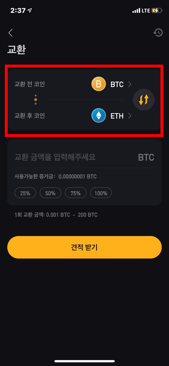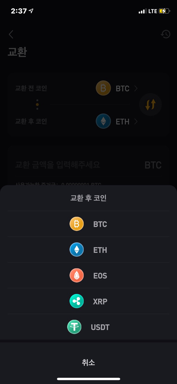 교환을 누르게 되면 이렇게 코인 교환을 할 수 있는 창이 뜨는데요, 내가 거래를 할 코인으로 바꾸어야겠지요!? 일단은 비트코인을 입금했으니 비트코인을 보유하고 있을 거예요 교환 전 코인은 비트코인을 누르시고