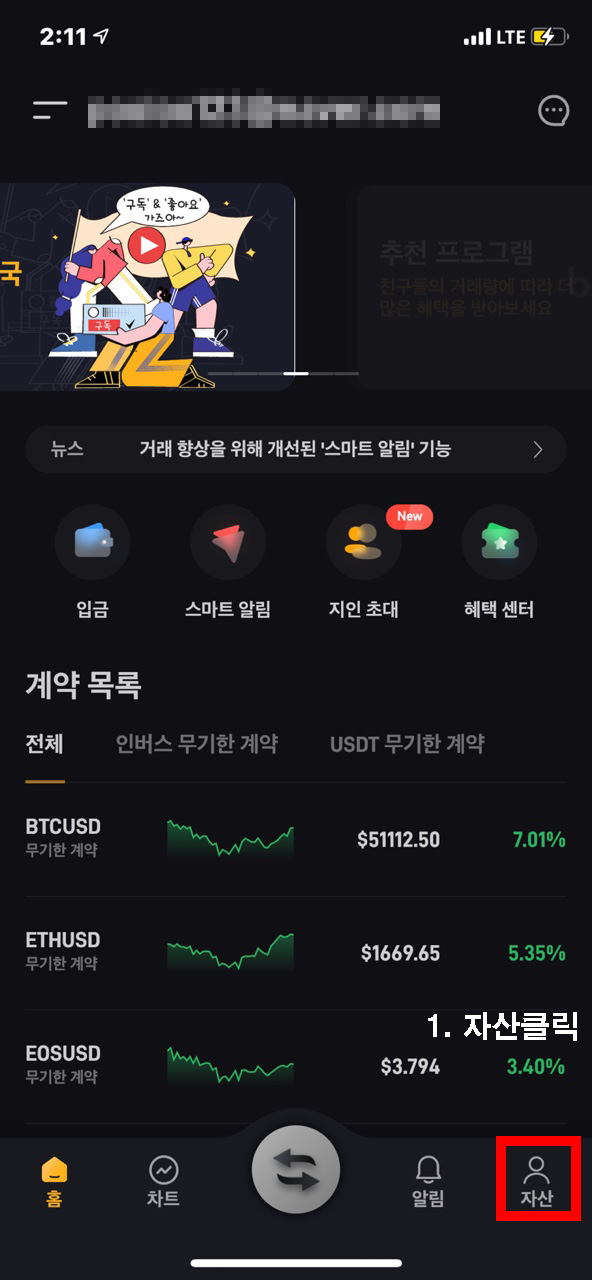 바이비트 어플을 누르시면 홈화면이 이렇게 나오는데요 바이비트 지갑 주소를 알기 위해서 자산을 눌러주시면 됩니다.