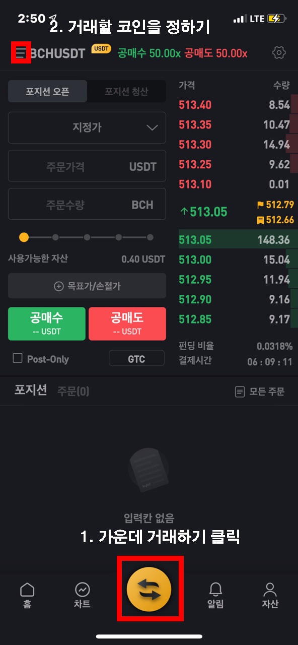 두 번 째는 USDT 계약인데요, 달러 개념의 코인인 테더로 거래를 하는 것입니다. 앞서 설명드린 인버스 무기한 계약과는 다르게 코인의 가치가 떨어지지 않기 때문에 주로 하시는 선물거래 방법입니다. 현재 비트코인, 이더리움, 테조스, 비트코인 캐시, 라이트코인, 체인링크를 거래하실 수 있습니다.