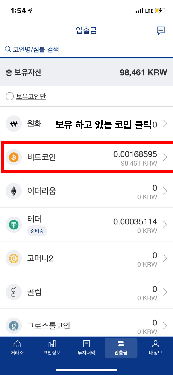 입출금을 누르시면 이제 보유하고 있는 코인이 나옵니다. 그 코인을 눌러주시면 됩니다. 저는 오늘 비트코인 기준으로 설명을 해드리기로 했으니 비트코인을 누르시면 됩니다. 다른 코인도 보유를 하시면 출금이 가능하니 참고 부탁드립니다.