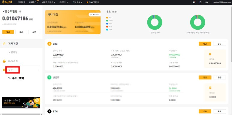 먼저 PC버전을 설명 드리겠습니다. 바이비트 홈페이지에서 나의 지갑으로 들어가시면 이런 화면이 나오시는 것 거래 하시던 분들은 아실텐데요 여기서 왼쪽에 있는 주문을 클릭해주시면 됩니다.
