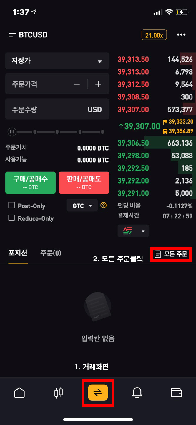 이번에는 모바일로 확인 하는 방법을 알아보겠습니다. 바이비트 모바일 어플을 키신 후에 거래 화면에 들어 가시고 모든 주문을 클릭 해주십니다. 그렇게 되면 자신이 거래했던 내역이 나오게 됩니다.