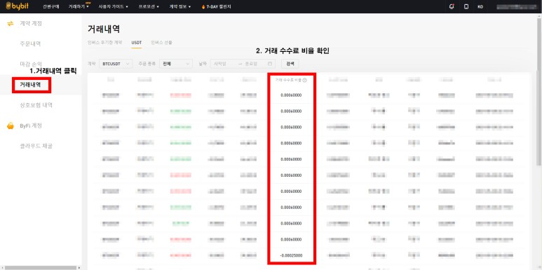 그리고 거래 내역에 들어가시면 거래 수수료 비율을 확인 하실 수 있는데요, 여기서 -0.00025 라고 나오는 것은 지정가로 거래를 했을 때 내가 수수료를 받는 것인데 이 건 모두가 똑같으니 확인을 안하셔도 됩니다.