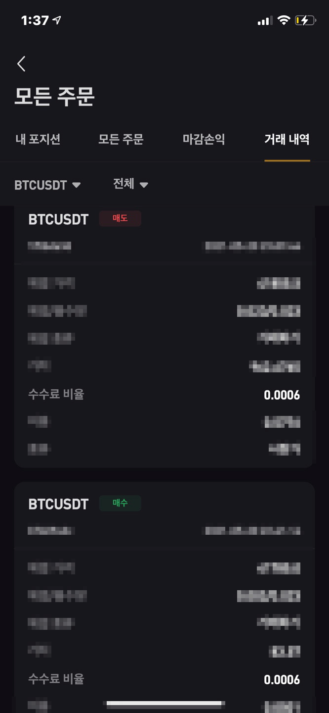 거래내역을 눌러서 보시면 PC버전에 나왔던 것 처럼 수수료 비율이 나오게 되는데 이게 자기가 낸 수수료 입니다. PC버전과 마찬가지로 0.0007이라고 나오면 수수료 할인을 아예 받지 못하고 있는 것이며 0.00063750으로 나오게 되면 15% 할인만 받고 있는 것이고 0.0007이면 수수료 할인을 아예 받고 있지 못하고 계시는 것 입니다.