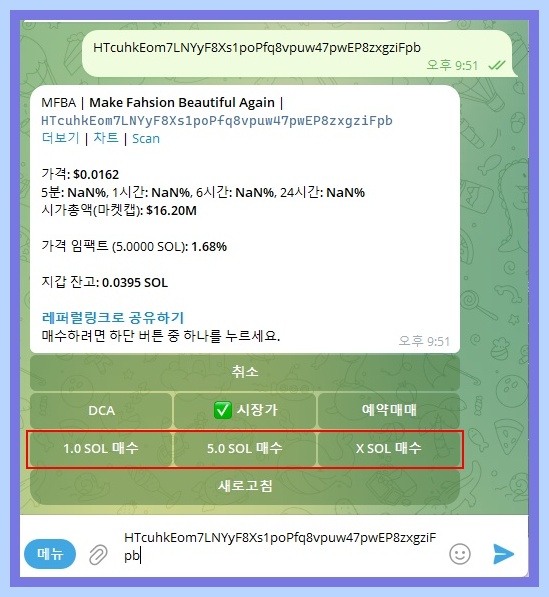 자동 매수 기능: 원하는 코인의 컨트랙트 주소(CA)를 채팅창에 입력하면 미리 설정된 매수 옵션에 따라 즉시 거래가 실행돼요.