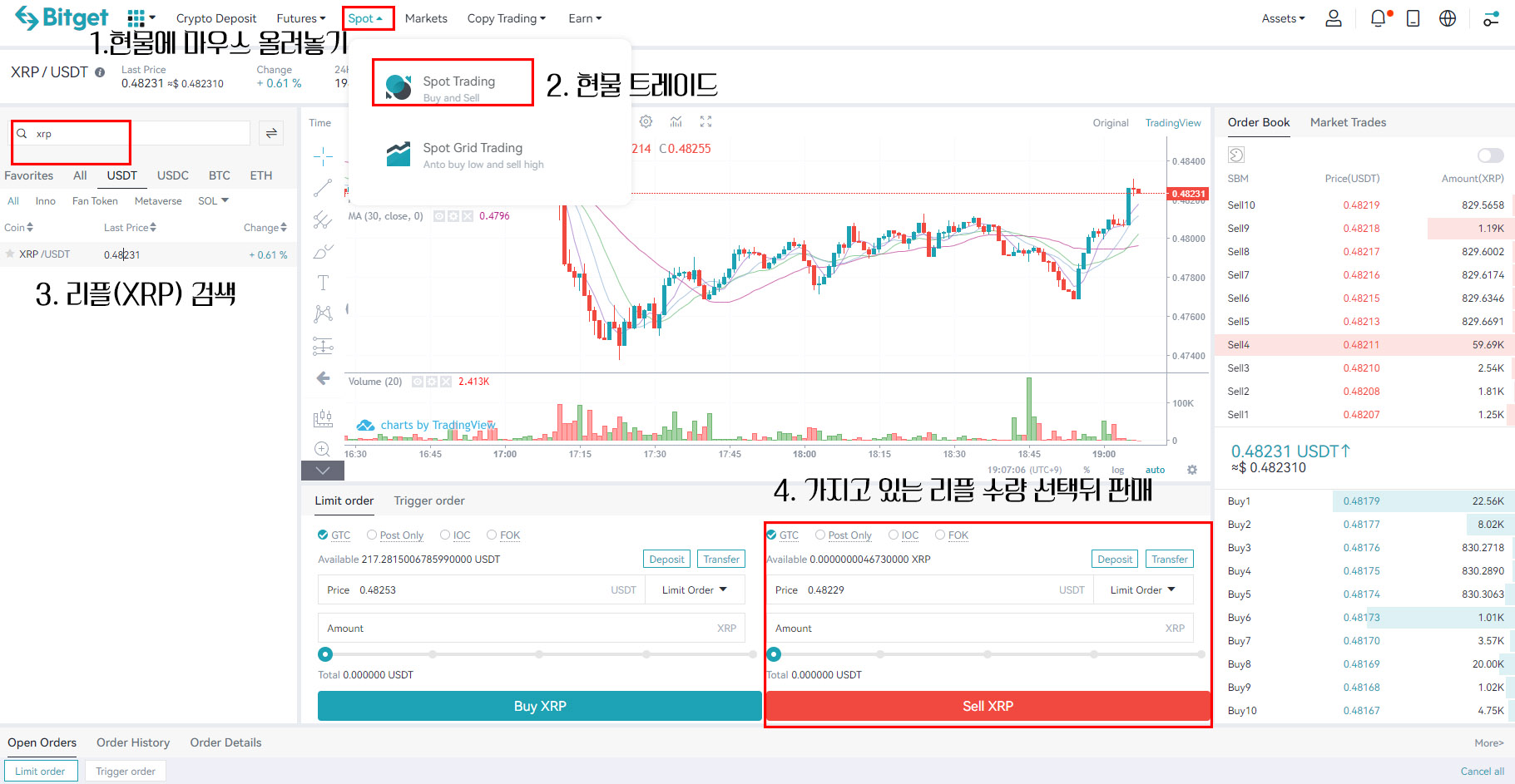 이렇게 리플이 비트겟으로 이동을 했으면 우리는 선물거래를 하기 위해서 리플을 판매하여 USDT라는 달러와 같은 코인으로 바꾸어주어야 하는데요, 방법은 위의 이미지를 따라 하시면 됩니다. Spot에서 Spot Trading -> 리플 검색 -> 리플 판매로 진행하시면 되는데요 어렵지 않지요?