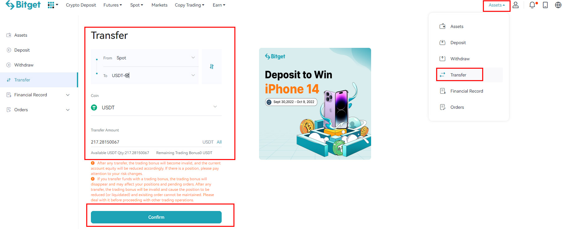 마지막 준비 단계인데요, 이제 USDT를 현물 지갑에서 선물 지갑으로 옮기셔야 합니다. 선물거래와 현물거래는 구분이 되어있기 때문인데요, 에셋에 마우스 버튼을 올려주신 후 Transfer를 클릭해 주십니다.