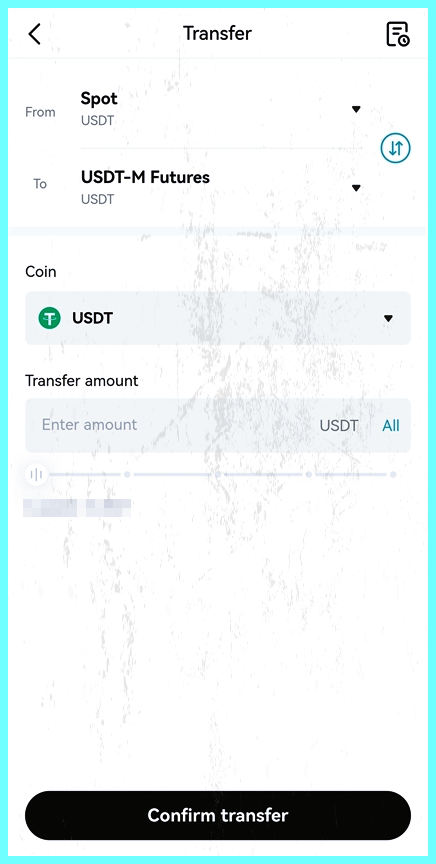 그럼 이런 화면이 나오게 됩니다. From에 Spot을 설정 해 주시고 To에 USDT-M Futures를 눌러주세요. 그 다음 USDT의 수량을 넣고 Confirm transfer를 눌러주시면 됩니다. 어렵지 않지요? 이러면 이제 선물거래를 하실 준비가 모두 완료가 됩니다.