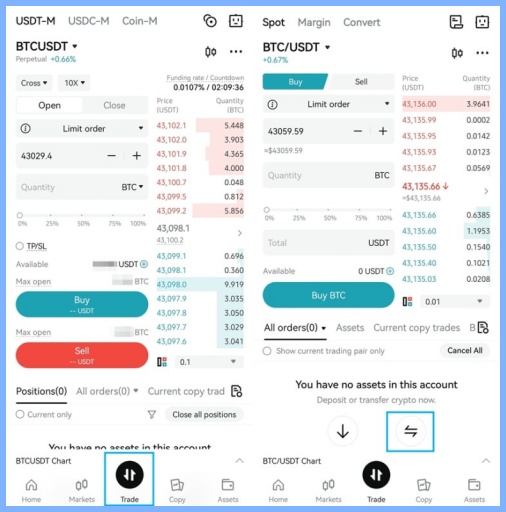 입금 된 코인을 어플 가운데 Trade를 꼭 누르신 후 Spot 트레이드로 설정 뒤 판매 하시면 USDT라는 코인 선물거래를 할 수 있는 일종의 달러가 생기게 됩니다.