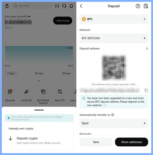 비트겟 앱을 열어서 오른쪽 위에 있는 "Add funds"를 누르고, "Deposit crypto" 메뉴를 선택하세요.