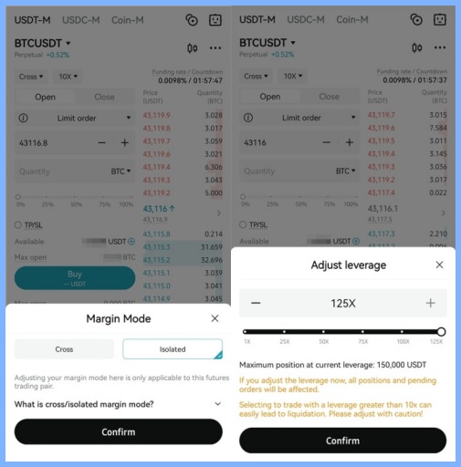 왼쪽 상단에 코인 목록중에서 거래 할 코인을 정해주시고 증거금 방식 교차(Cross)와 격리 (Isolated) 두가지 중 한가지를 선택 해주시면 됩니다.
