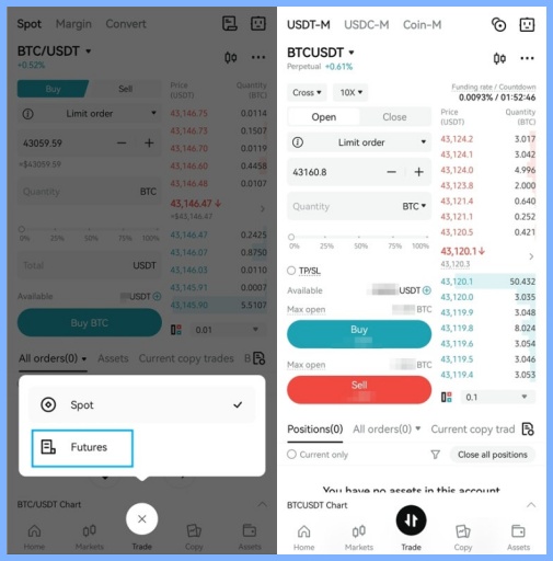 입금 된 코인을 어플 가운데 Trade를 꼭 누르신 후 Spot 트레이드로 설정 뒤 판매 하시면 USDT라는 코인 선물거래를 할 수 있는 일종의 달러가 생기게 됩니다.