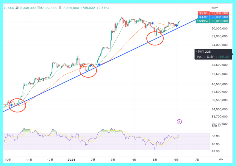 이 세 번의 조정 속에서도 비트코인은 상승 추세선을 유지해 왔습니다. 현재 시세가 이 지지선을 지킬지, 아니면 하락 신호를 보일지 주목할 필요가 있습니다.