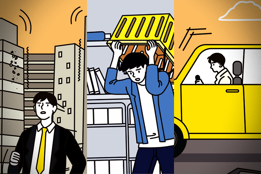 지진이나면 기둥과 벽과 같은 지지물들이 뒤틀리면서 출입문이 안 열리는 경우가 있는데요, 그래서 지진이 나면 밖으로 피신하는 것이 가장 중요하기 때문에 출입문부터 열어 놓고 탈출구를 확보하셔야 합니다.