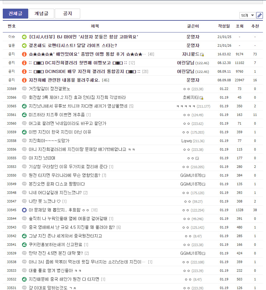 정말 웃픈 얘기가 아닐 수 없는데요, 우리나라에서 지진이 났을 때 가장 빨리 알 수 있는 곳이 바로 기상청, 뉴스, 재난 문자도 아닌 바로 DC인사이드의 지진희 갤러리라고 하네요... 연예인 지진희 씨인데요, 이름에 지진이 들어가서 그곳에 들어가면 지진이 났는지 안 났는지, 지진의 강도, 지진이 어디서 났는지 등을 빠르게 알 수 있다고 합니다.