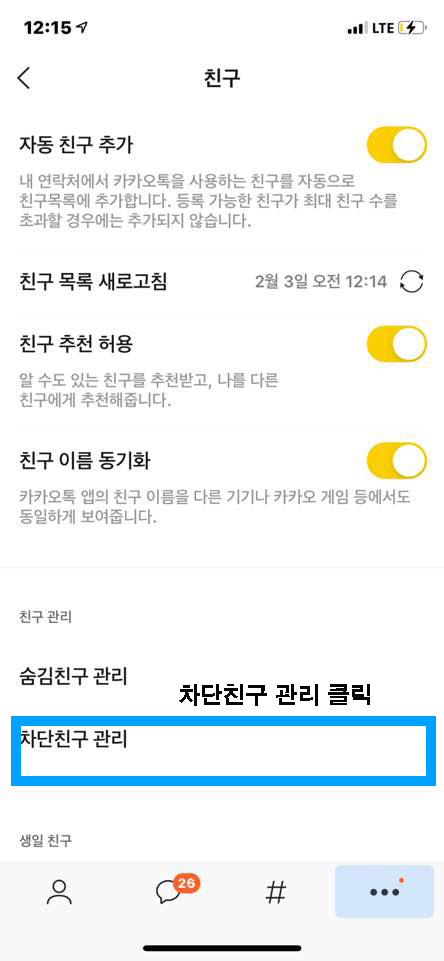 그리고 친구창을 클릭하시면 자동 친구 추가, 친구 목록 새로고침, 친구 추천 허용, 친구 이름 동기화 그리고 친구 관리란에 숨김 친구 관리, 차단 관리 친구가 뜨실 텐데요 우리는 차단 친구한테 프로필을 비공개 하기 위해서 차단친구 관리를 클릭해 줍니다.