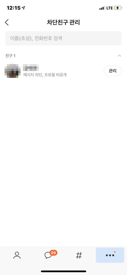그럼 우리가 처음에 차단을 했던 내 프로필을 비공개하고 싶은 상대가 차단 친구 목록에 나오게 되는데요, 여기서 차단 친구의 프로필 옆에 뜨는 관리를 클릭해 주시면 됩니다.