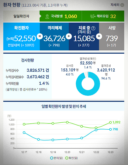 현재 12월 23일 기준 누적 확진자 및 일일 확진자 기록 입니다. 오늘은 1092명이나 확진자가 발생을 했네요.. 내일이라도 줄어 들었으면 하는 바램입니다.