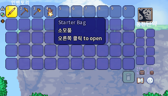 이렇게 칼라미티 모드, 레세피 브라우저, 한글패치 등 모두 적용 된 것을 확인 하실 수 있습니다. 게임을 실행시키면 잘 적용이 되었는데 더 확실히 확인 하려면 인벤토리에 스타터팩이 들어있으면 칼라미티가 적용이 된 것을 아실 수 있습니다.