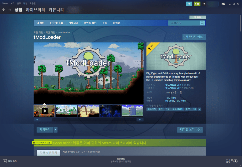 먼저 저는 컴맹이라서 이런 것을 잘 하지 못하는데, 생각보다 어렵지 않아서 여러분도 하실 수 있을 거라 생각이 듭니다. 첫 번째로 스팀을 실행해주신 뒤 Tmodloader를 다운로드해주십니다.
