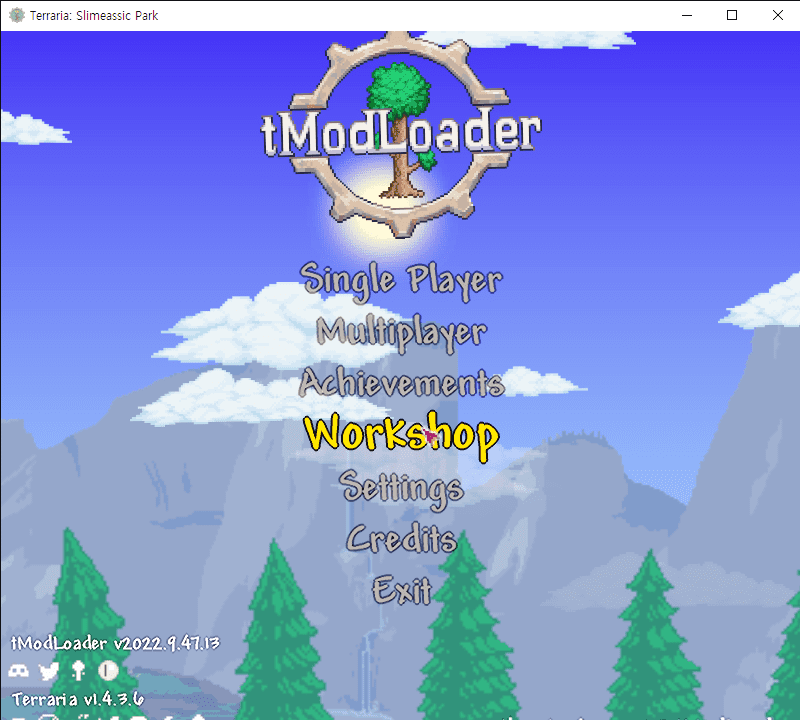 이렇게 창모드로 실행된 tmodloader에서 네 번째에 있는 워크 샵을 눌러주십니다.