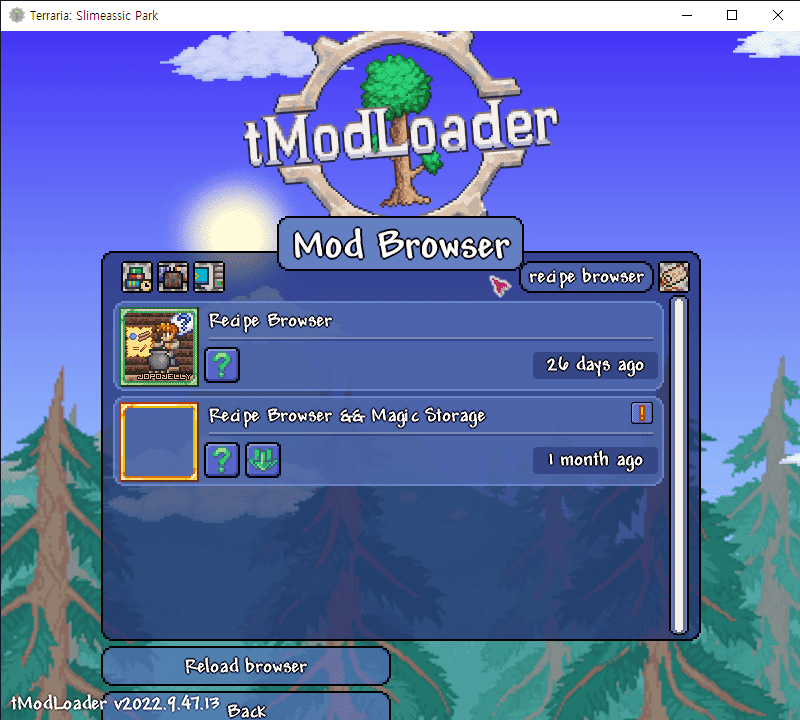 팁을 한 가지 더 드리자면 한글패치, 칼라미티 모드 뿐만 아니라 여기서 레시피 브라우저라는 모드도 다운로드해주시면 굉장히 신세계이니 게임을 즐기시는데 도움이 되실 거예요. 이 레시피 브라우저 모드도 다운로드를 꼭 해주세요.