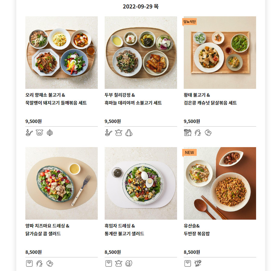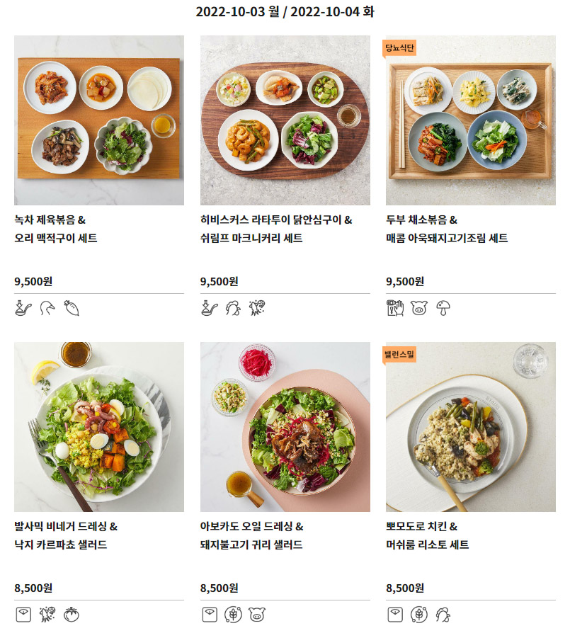 어떤 식으로 식단이 나오는지 궁금하실 텐데요, 위의 이미지를 보시면 위와 같이 매일 바뀌는 메뉴를 본인이 직접 선택을 하실 수 있습니다.