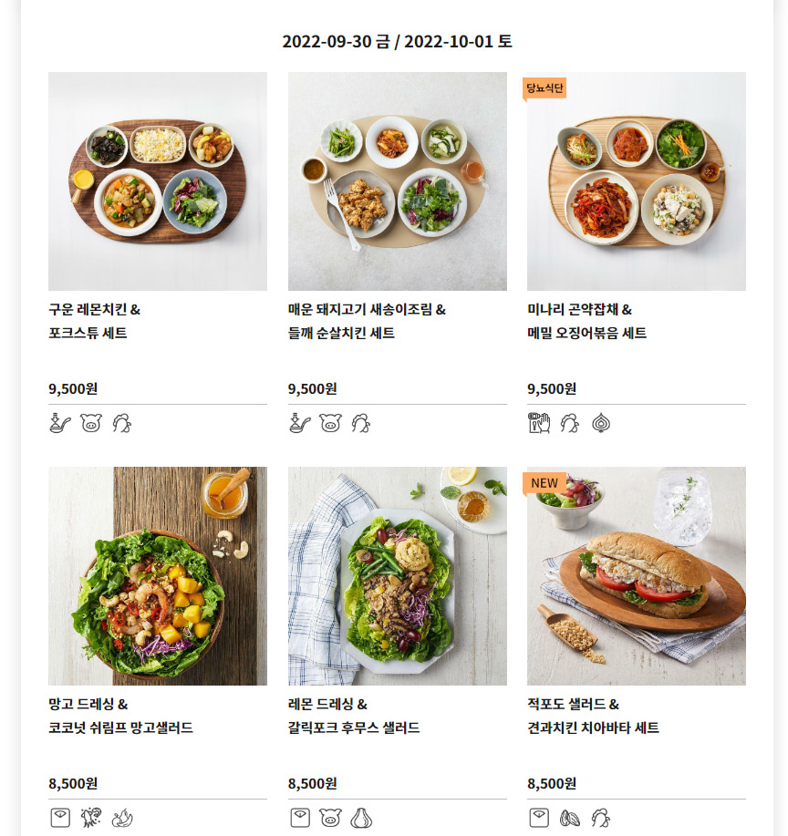 어떤 식으로 식단이 나오는지 궁금하실 텐데요, 위의 이미지를 보시면 위와 같이 매일 바뀌는 메뉴를 본인이 직접 선택을 하실 수 있습니다.