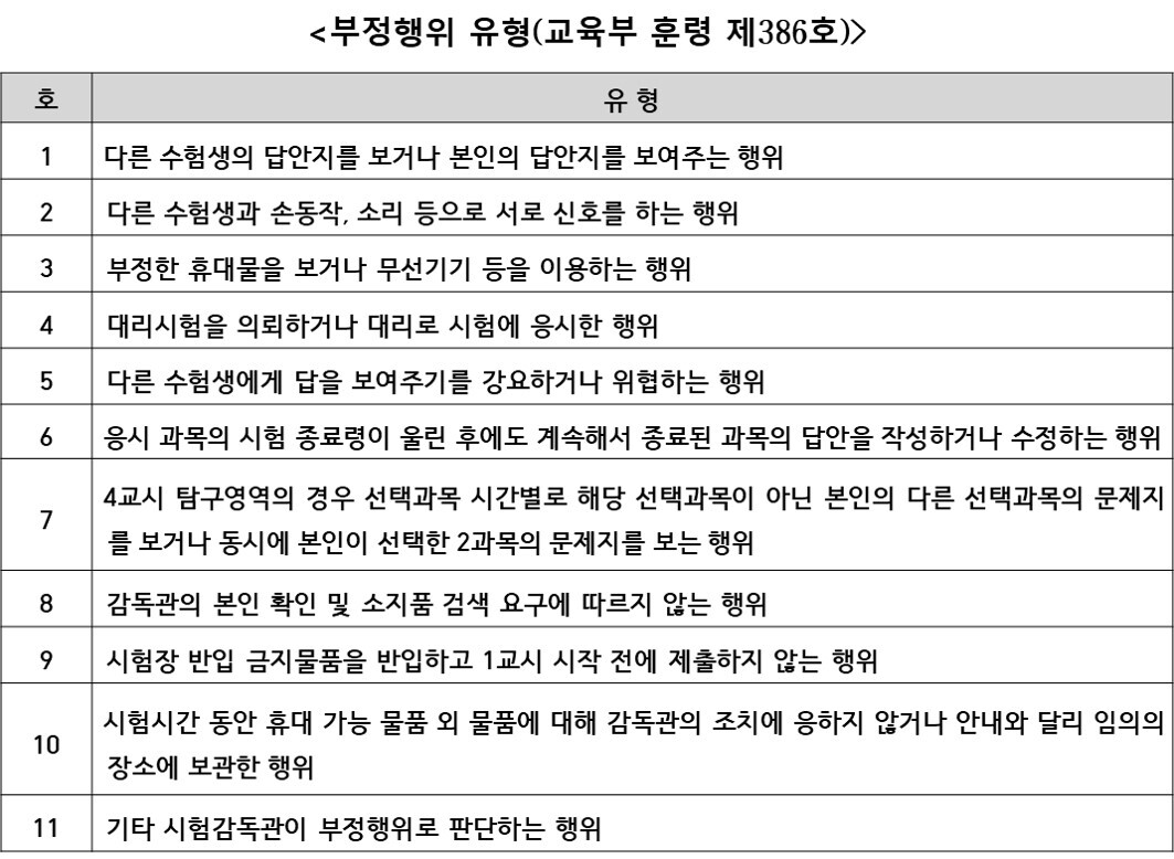 시험장 반입금지 물품과 휴대 가능 물품의 종류 그리고 관리절차 등은 수험생 주의사항 등 관련 지침을 확인하셔야 하고 휴대용 금속탐지기를 복도감독관에게 지급하여 사용할 수 있습니다. 이 밖에 부정행위 유형에 대해서 아래 이미지를 참고해보시길 바랍니다.