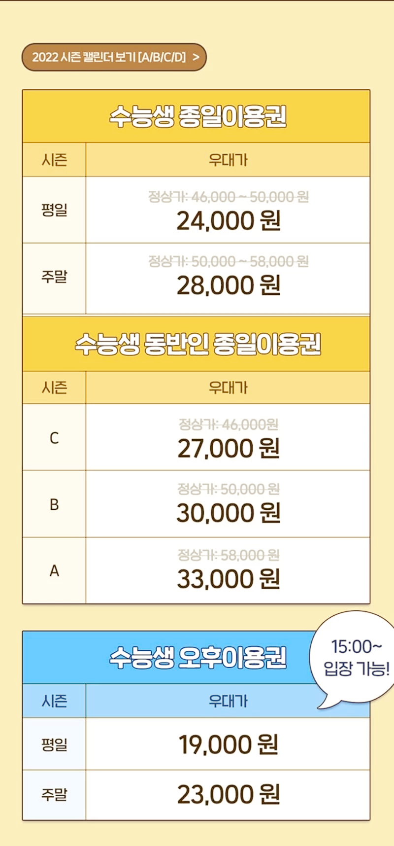 하지만 수험생 동반인은 시즌별로 가격이 다른데요. C 시즌은 27,000원, B 시즌은 30,000원, 그리고 A 시즌은 33,000원에 에버랜드 이용권 구매가 가능합니다.