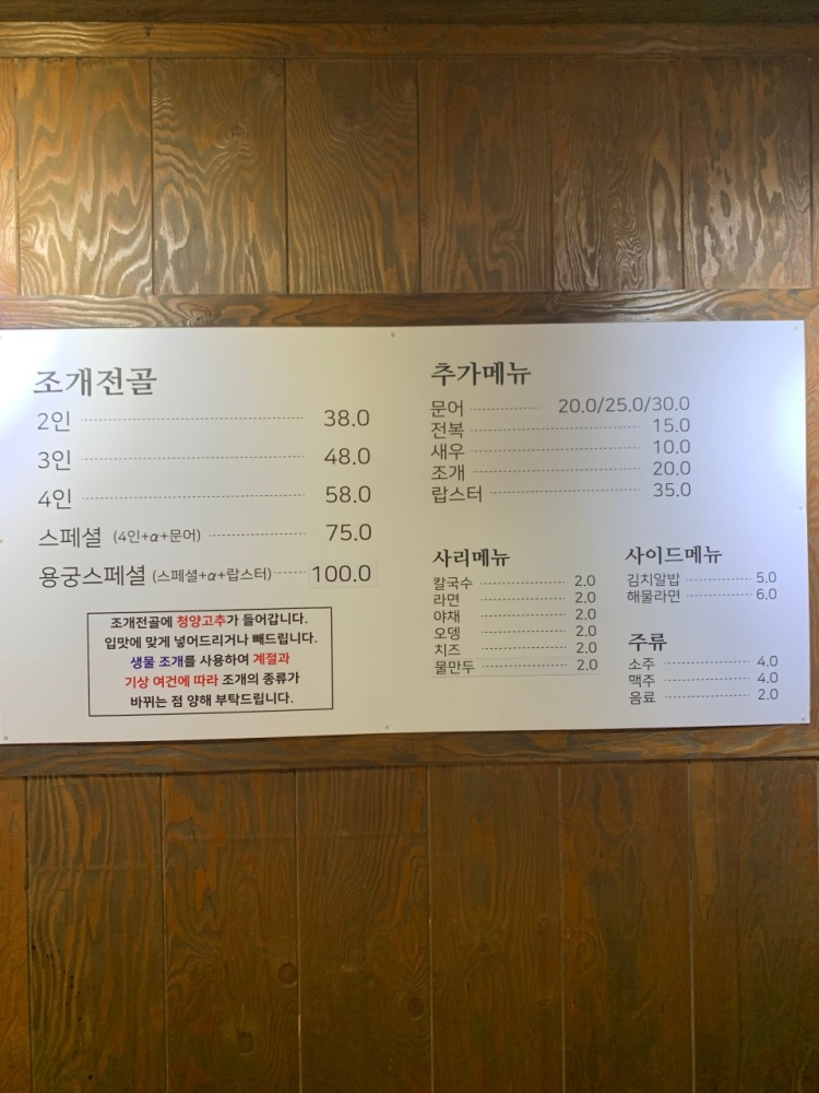 메뉴판을 보시면 깔끔하고 여러 사리도 있으니 추가해서 드시면 될 것 같아요 조개찜 드시러 가보시면 비싸기만 하고 맛은 정말 없는 곳들이 많은데요 청년조개는 신선한 재료로 생생정보를 보니 정말 맛있겠습니다.