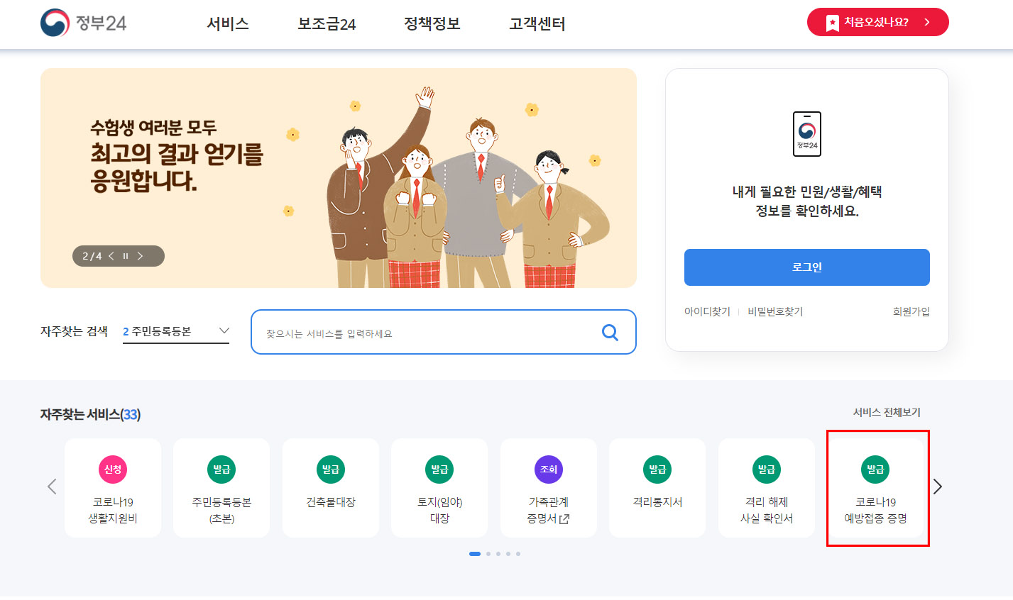 자주 찾는 서비스 -> 코로나 19 예방접종 증명